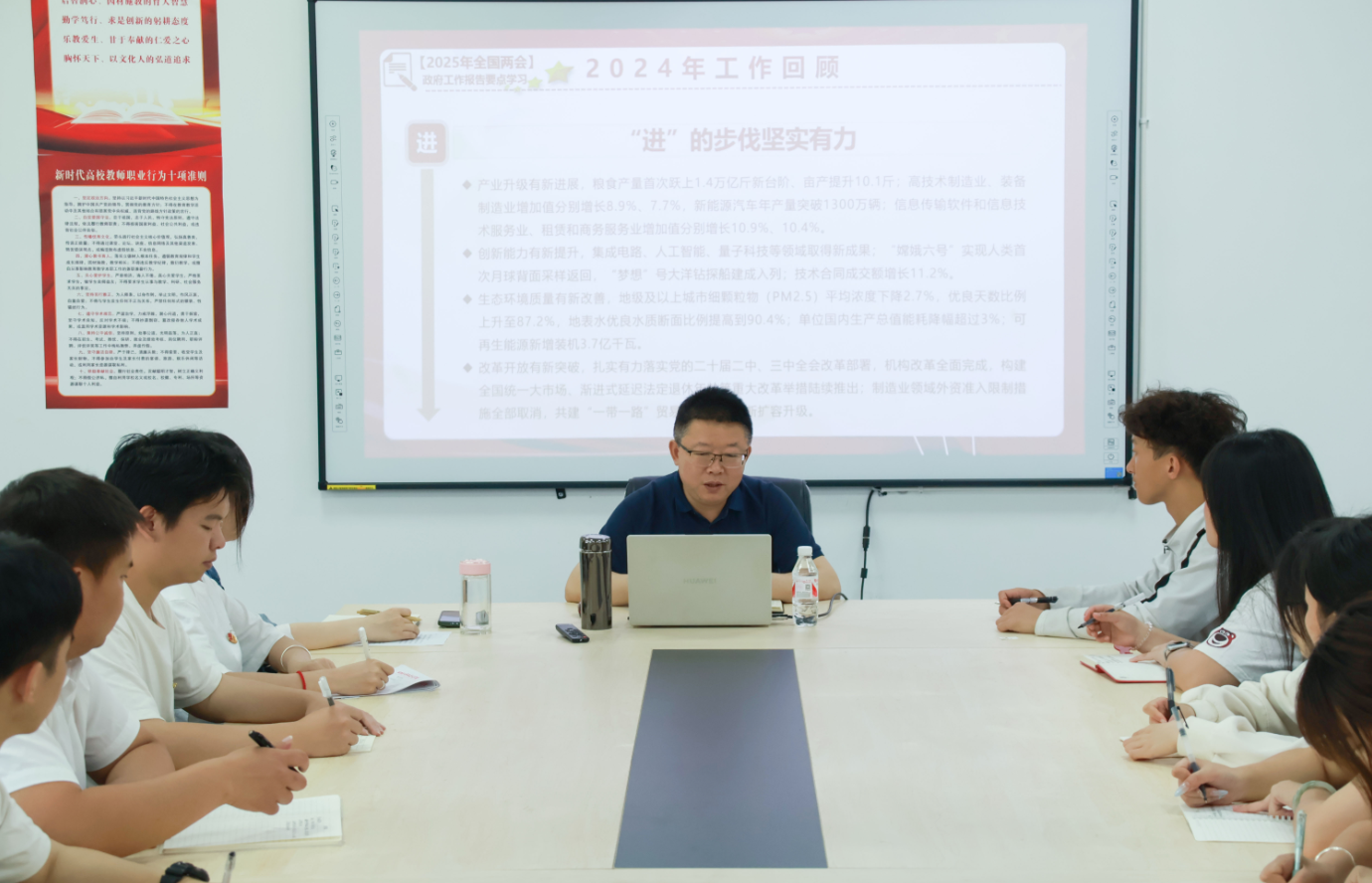 文申柳在开篇中指出,全国两会是国家政治生活的重要盛会,其精神内涵与青年学子的成长发展息息相关。他强调,2025年作为“十四五”规划收官和“十五五”规划奠基的关键节点,政府工作报告不仅擘画了国家未来发展蓝图,更与每位学生的职业前景紧密相连,引发了在场学生的深刻思考。