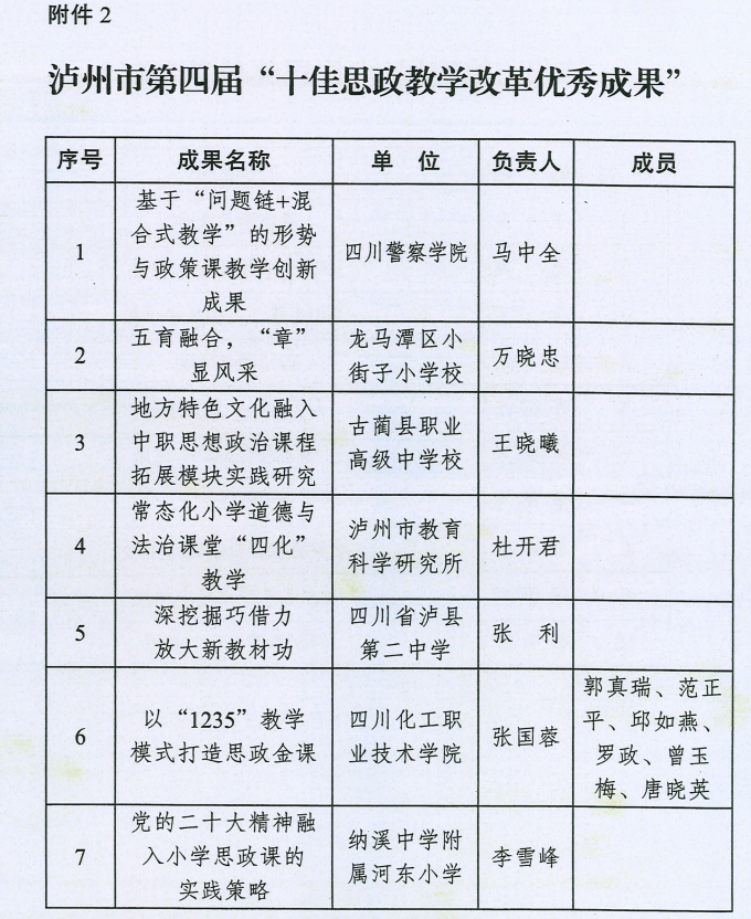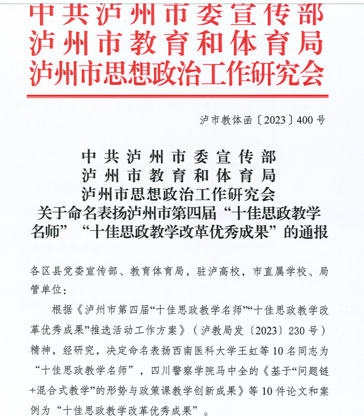 近日,由泸州市委宣传部、市教育局、市政研会联合组织开展的泸州市第四届思政教学“双十佳”评选结果揭晓,经各驻泸高校和县区教育局推荐初评、专家评审和市委宣传思想工作领导小组成员评审,我校马克思主义学院范正平教授荣获泸州市第四届“十佳思政教学名师”称号,张国蓉教授等参与的项目《以“1235”教学模式打造思政金课》荣获泸州市第四届“十佳思政教学改革优秀成果奖”。