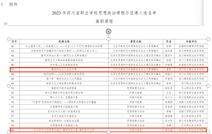 近日,四川省教育厅公布了2023年四川省职业学校思想政治课程示范课入选结果。前期根据《四川省教育厅关于开展职业学校思想政治课程示范课评选的通知》相关要求,经各职业学校(含技工学校)推荐申报,教育厅组织形式审查、省级评审,共评选出2023年四川省职业学校思想政治课程示范课200门,高职课程100门、中职课程100门,其中我校马克思主义学院曾玉梅老师的作品《以习近平文化思想为指引赓续历史文脉建设现代文明》、唐悦老师的作品《建设社会主义生态文明》成功选入四川省职业学校思想政治示范课。