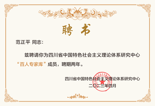 为凝聚四川理论界优秀人才共谋理论研究发展大局,四川省中国特色社会主义理论体系研究中心面向全省党政机关、高校、党校、社科研究机构等单位广发“英雄帖”,吸纳优秀理论研究人才进入“百人专家库”。经过前期的推荐、遴选,我院院长范正平教授入选。