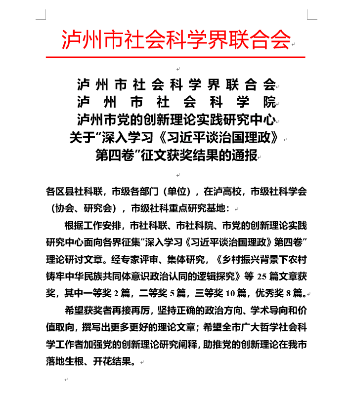 近日,市社科联、市社科院、市党的创新理论实践研究中心联合举办的“深入学习《习近平谈治国理政》第四卷”征文获奖结果公布,经专家评审、集体研究,学校基础直属党支部书记、马克思主义学院院长范正平,马克思主义学院教师丁嘉的作品在25篇文章中脱颖而出,分别获得“三等奖”。