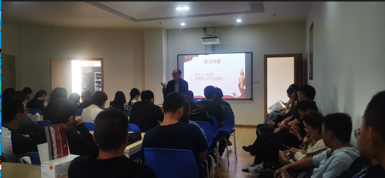 在党的二十大胜利开幕、全国上下掀起学习热潮之际,基础支部按照学校党委的统一安排,利用新学期第一次线下政治学习组织支部全体教职工学习党的二十大精神。