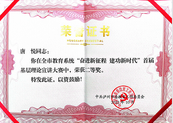 近日,由中共泸州市委教育工作委员会主办的泸州市教育系统“奋进新征程建功新时代”首届基层理论宣讲大赛在泸州市举行。经各区县党委教育工委、在泸高校、市属学校推荐,市委宣传部、市委讲师团专家评审组评选,产生泸州市教育系统首届基层理论宣讲大赛一等奖2名,二等奖3名,三等奖12名。我校马克思主义学院教师唐悦获得二等奖。