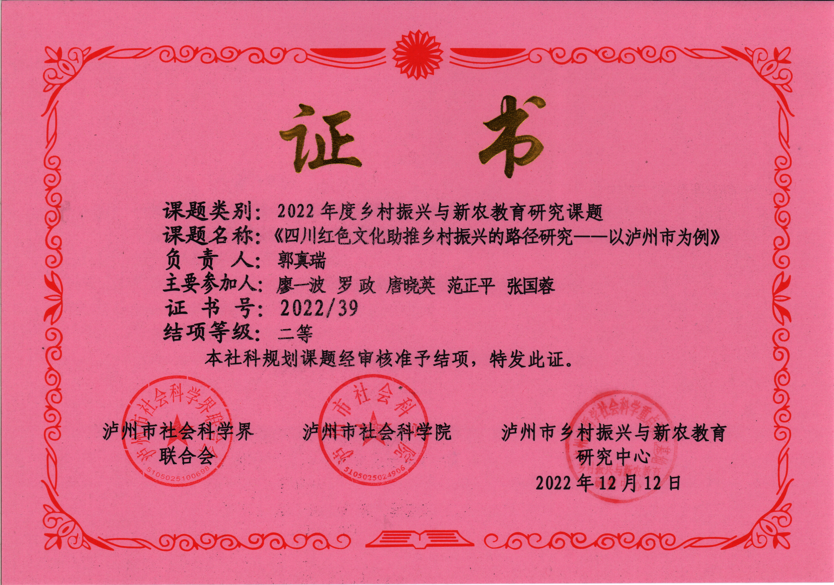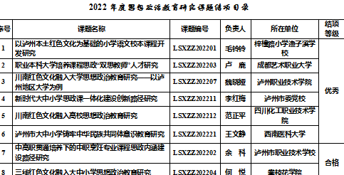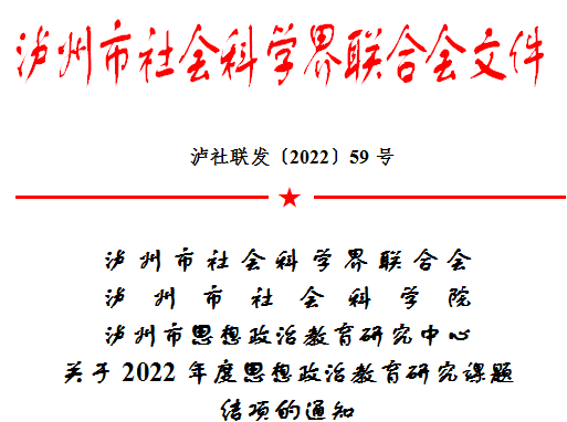 聚焦事关国家战略和泸州发展的重大理论和现实问题,坚持理论联系实际,解决实际问题,经专家评审,市社科联等单位审定,马院院长、教授范正平的课题《川南红色文化融入高校思想政治教育研究》于2022年12月结题并在《以泸州本土红色文化为基础的小学语文校本课程开发研究》等18项课题中荣获优秀;马克思主义学院院副院长郭真瑞负责的课题《四川红色文化助推乡村振兴的路径研究---以泸州市为例》(课题成员:廖一波、罗政、唐晓英、范正平、张国蓉)在泸州市“2022年度乡村振兴与新农教育研究”专项课题中荣获泸市社科联、泸州市社会科学院、泸州市乡村振兴与新农教育研究中心联合颁发二等奖;马克思主义学院教授唐晓英的课题《一体两翼”战略部署下泸州市人口变动新趋势与经济高质量发展对策研究》在泸社联、泸人口与发展中心2022年度人口与发展研究课题中荣获一等奖。在此表示祝贺!