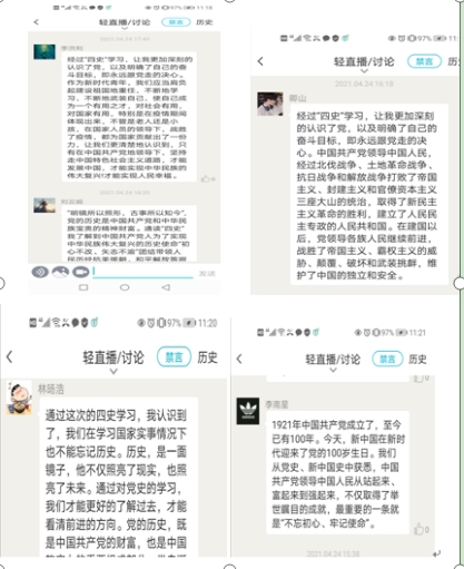 同学们纷纷表达了自己的感想。机械工程学院建筑工程1931班林旸浩讲到:通过这次的四史学习,我认识到了,历史是一面镜子,他不仅照亮了现实,也照亮了未来。通过对党史的学习,我们才能更好的了解过去,才能看清前进的方向。药品与环境工程学院药品生产技术1933班李洪利同学表示: 经过“四史”学习,让我更加深刻的认识了党,以及明确了自己的奋斗目标,即永远跟党走的决心。作为新时代青年,我们应当肩负起建设祖国地重任,不断地学习,不断地武装自己,使自己成为一个有用之才,对社会有用,对国家有用。